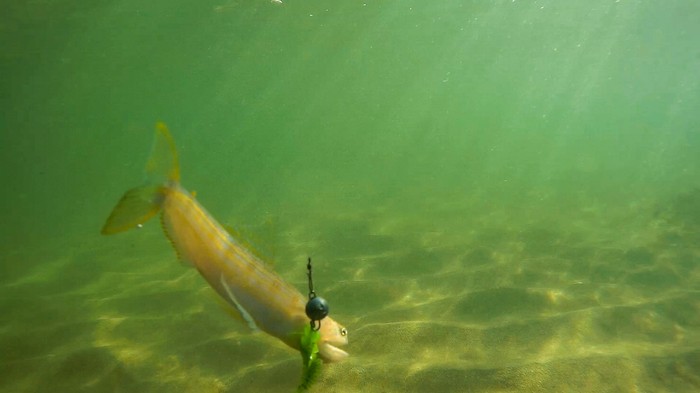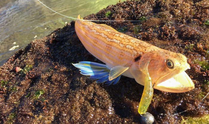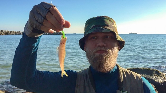 Ящероголов - Lizardfish. Lat. Synodus myops. Донная рыбка, обитающая преимущественно недалеко, в районе 80 метров, от берега. Закапывается в песок, оставляя наружу одни глаза и поджидает добычу. У меня тем временем потерян счёт поклёвкам, одно радует, клюёт на любую приманку.