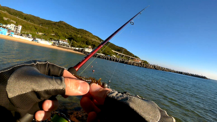 Перемещаюсь ближе к пирсу к волнорезам. Здесь в пределах заброса много водорослей и камней на дне, а значит есть шанс взять морского окуня!