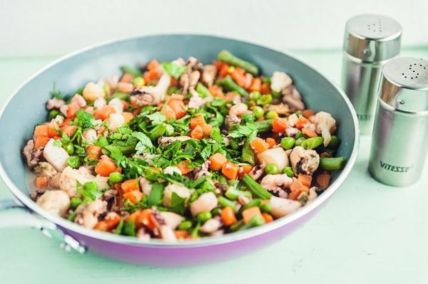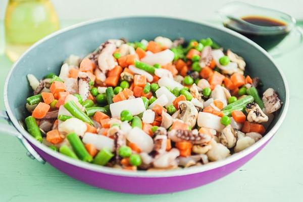 Добавить овощную смесь. Обжарить вместе с морепродуктами в течение 7 – 10 минут.