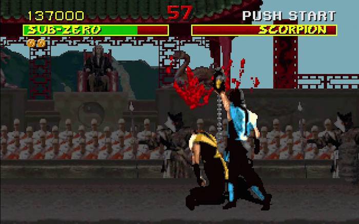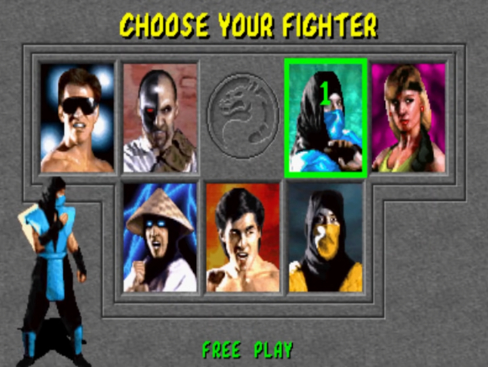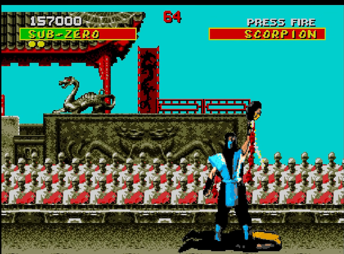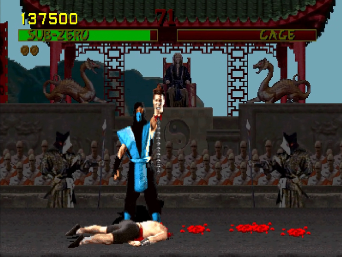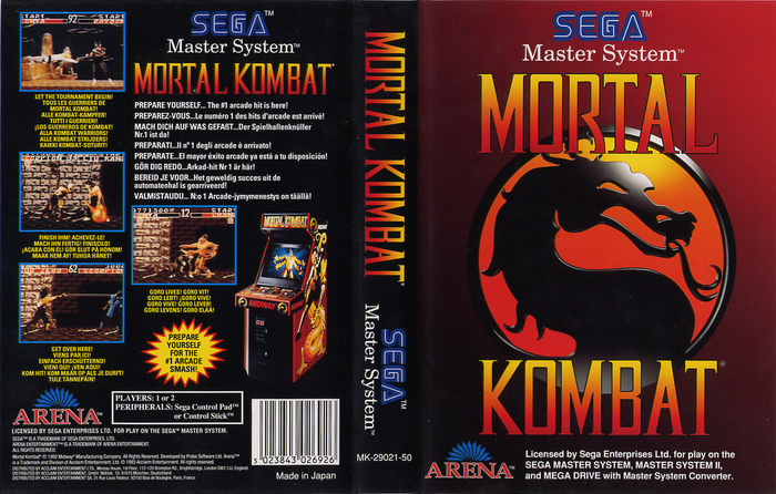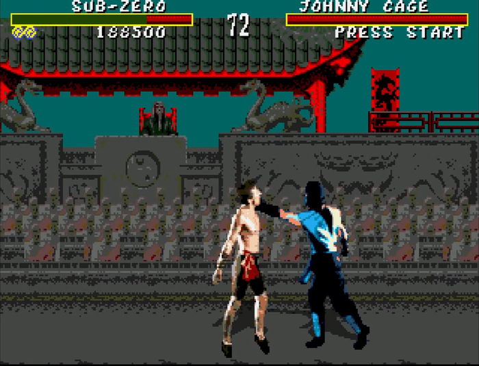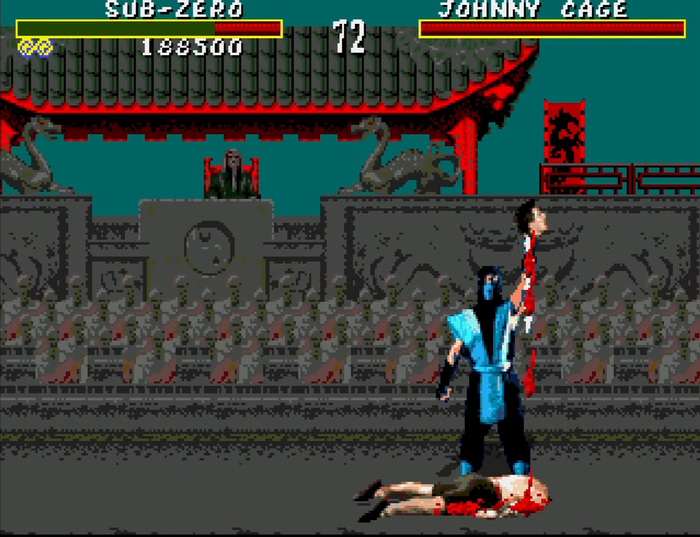 Самое первое появление игры. Аркадный кабинет и всё отсюда выходящее. Большие реалистичные спрайты, качественная музыка и куча эффектов. И самоё главное, кровавые фаталити, до сего момента просто новинка в играх. Жестокие добивания врагов. Ух! Повеселимся! Единственный минус для меня - управление стиком (палкой) очень неудобно.