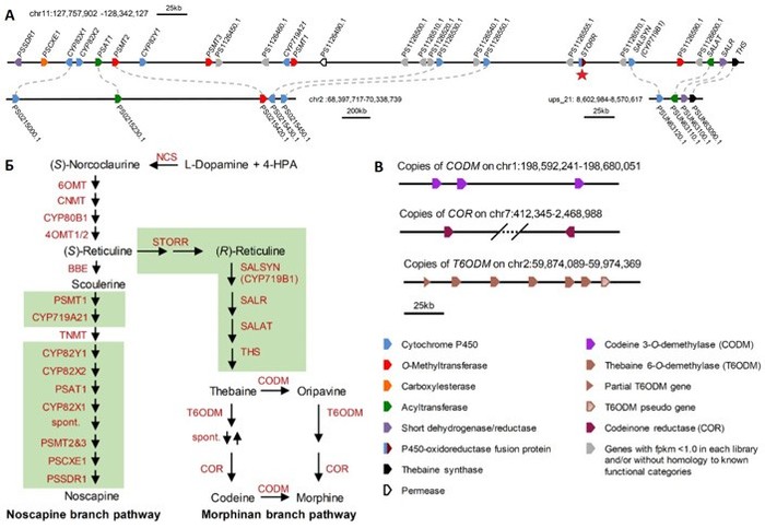 Авторы реконструировали последовательность реакций биосинтеза опиатов, а затем провели целенаправленный поиск генов, катализирующих основные реакции. Схема всех реакций с указанием генов соответствующих ферментов приведена на рис. 4. Оказалось, что 15 генов, задействованных в этих реакциях, располагаются на 11-й хромосоме в едином кластере. После полногеномной дупликации три из этих 15 генов не только сохранились в двух копиях, но и подверглись дополнительно локальным дупликациям. А один из генов этого кластера — STORR ((S)- to (R)-reticuline), необходимый для синтеза морфина и родственных ему соединений-опиатов, сформировался в результате слияния двух ранее существующих генов: гена семейства цитохромов P450 и гена оксидоредуктазы (на рисунке этот ген показан сине-бордовым значком). Белок, который кодируется геном STORR, катализирует сразу две сопряженные химические реакции, необходимые для превращения более раннего предшественника в более поздний предшественник опиатов. То, что гены-участники биосинтеза алкалоидов установлены верно, подтверждается анализом РНК: эти гены интенсивно экспрессируются именно в тех частях растения, где синтезируются значительные количества данных веществ.