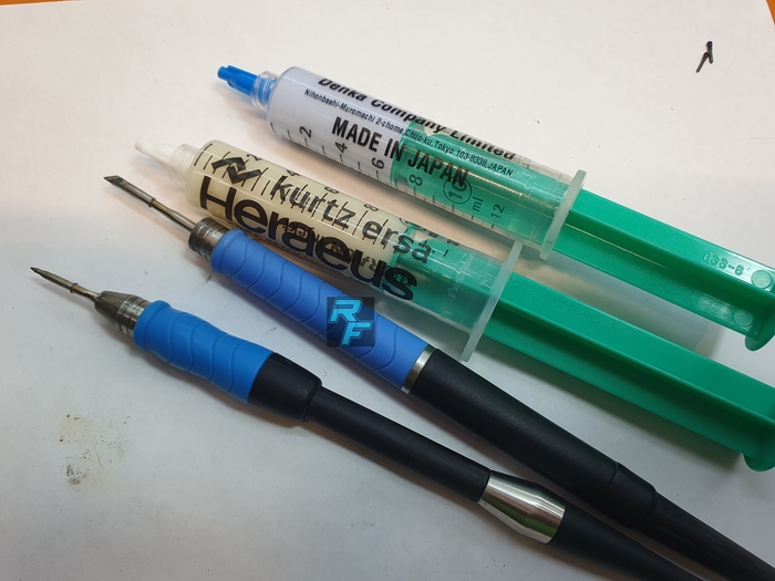 Припой и кусочки оставшейся микры на контактах я снимаю низкотемпературной каплей припоя, феном и пинцетом