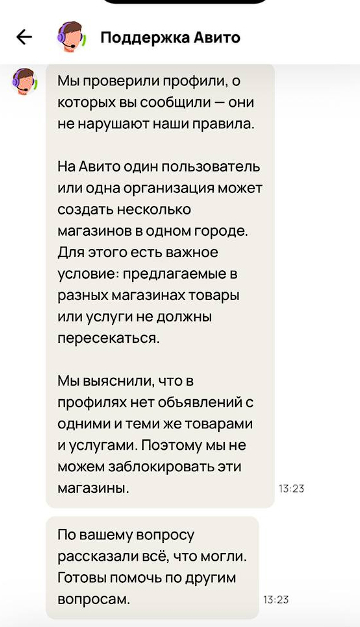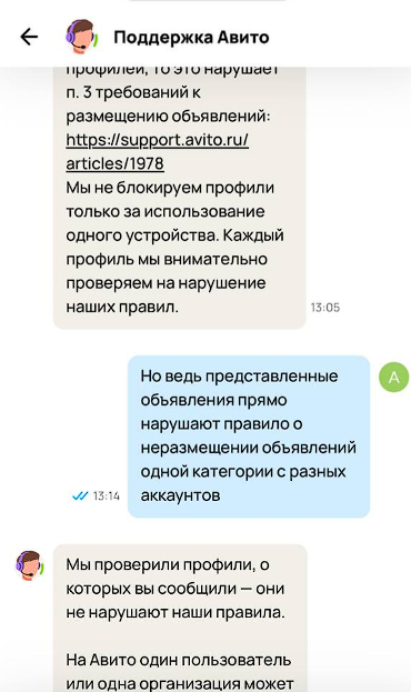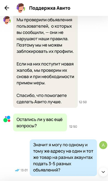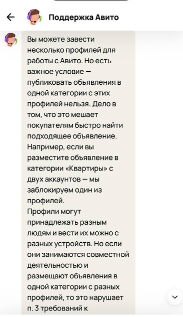 Чтобы разобраться в ситуации, я обратился с дополнительным вопросом: «Значит, я могу по одному и тому же адресу и на один и тот же товар подать 3-5 объявлений через разные аккаунты?» Ответ был таким: «Вы можете создать несколько профилей, но важно, чтобы объявления не публиковались в одной категории, так как это мешает пользователям быстро найти подходящие объявления.»