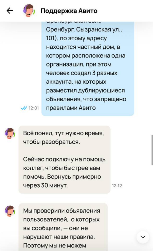 Теперь, внимание, вот где начинается настоящий абсурд: Авито активно рекламирует, что все профили и объявления тщательно проверяются. Но если эти три аккаунта, размещающие дублирующие объявления по одному адресу, не нарушают правила, то, возможно, вопрос в том, что такие аккаунты просто оплачивают размещение и остаются за пределами санкций.