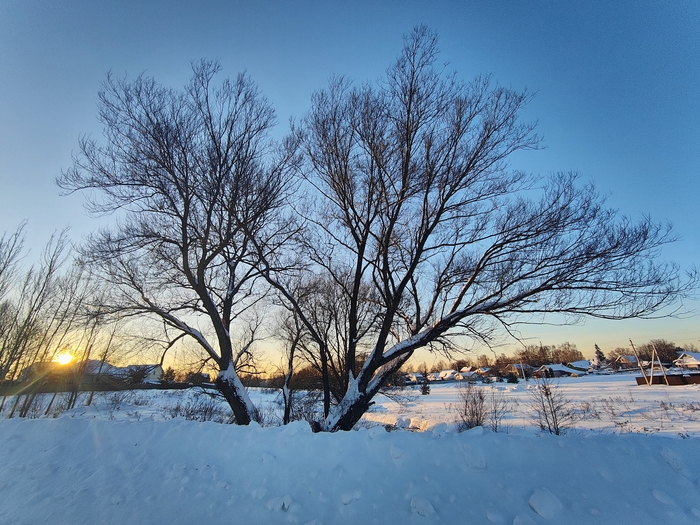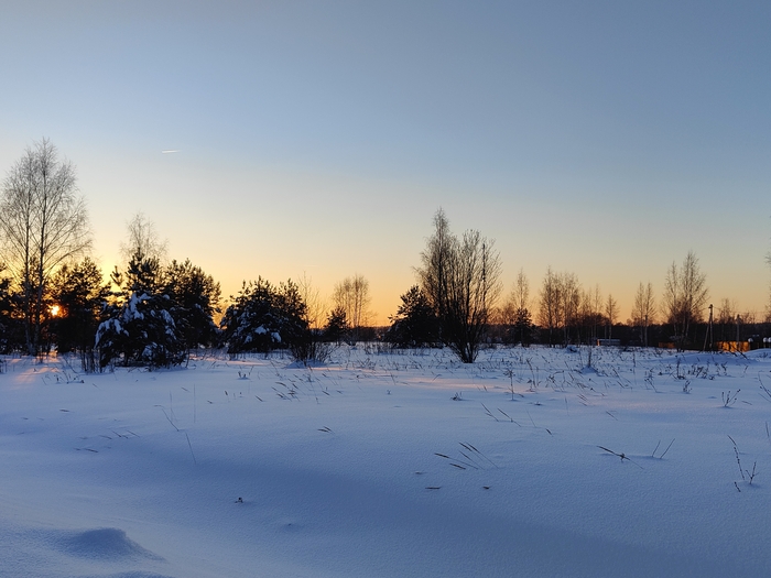 Предзакатное небо добавляет красок в черно-белые зимние пейзажи.
