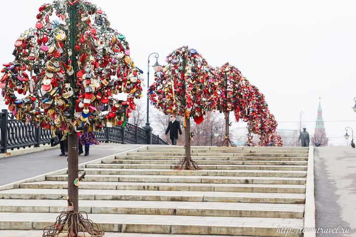 Есть в Москве Лужков мост или мост влюблённых. Красивая, романтическая штука. По всему мосту установлены стальные деревья, на ветвях которых влюблённые пары вешают замки, а ключи выбрасывают в реку в знак нерушимой любви. Может быть кто-то и оставляет запасной ключик, но это некрасиво... ))). Вот так он выглядит. Но однажды я подошёл поближе и увидел... Но об этом ниже.