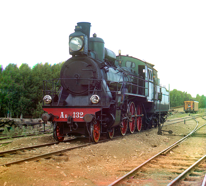 Переместимся с воды на сушу. В 1910 году на Самаро-Златоустовской железной дороге Прокудин-Горский сфотографировал паровоз Аб-132. Локомотив всего год как вышел из цехов Брянского завода. Паровозы типа «Б» носили ласковое прозвище «Букашка». До 1912 года они были самыми быстрыми на российских железных дорогах: скорость — до 125 км/ч!