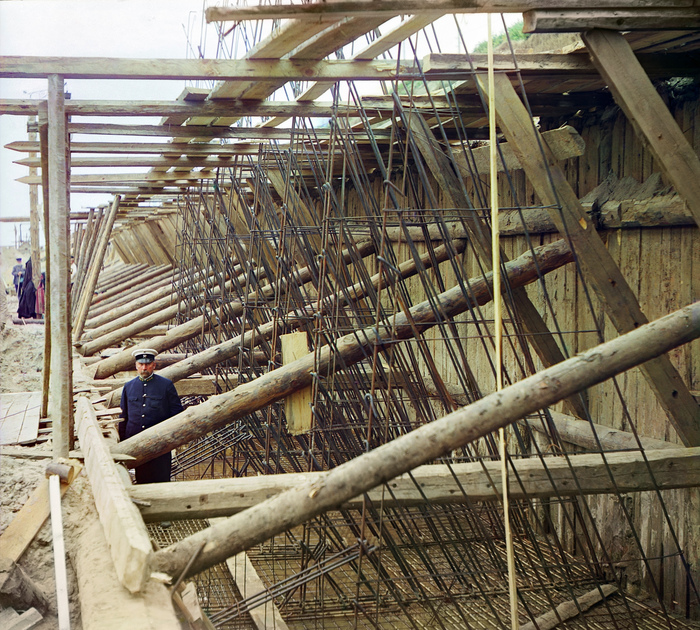 Возле села с красивым названием Белоомут Прокудин-Горский подробно снимает процесс строительства гидротехнических сооружений. Шлюзы и плотины делают по последнему слову тогдашней техники — из железобетона. Кажется, что процесс вязки арматуры мало отличается от нынешнего.