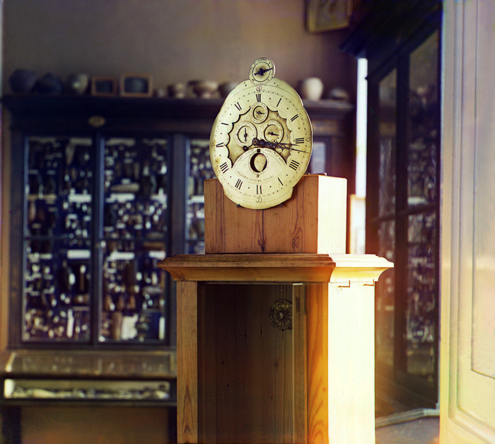 Технические диковинки начали появляться в России не только на рубеже XIX и XX веков. В Тверском музее Прокудин-Горский сфотографировал уникальные астрономические часы Терентия Ивановича Волоскова. Этот русский изобретатель вполне мог бы считаться вторым Кулибиным. Будучи самоучкой, ещё в XVIII веке он изготовил часы, которые показывали не только минуты и часы, но и дни календаря, праздники, фазы Луны, движение Солнца по знакам зодиака, високосные годы и т. д. Часы хранятся в музее и поныне.