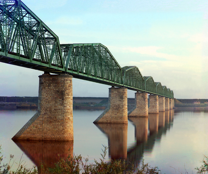 Замечательный свет удалось поймать фотографу на этом снимке железнодорожного моста через Каму, что около Перми. Он выглядит вполне современно, хотя построен ещё в конце XIX века. Отчасти он сохранился и до наших дней, хотя пролёты были заменены, а опоры — расширены для двухпутного движения.