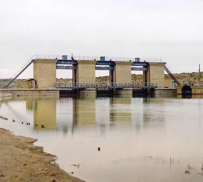Совсем в другом уголке огромной империи Прокудин-Горский запечатлел новую плотину на реке Мургаб, что в пустыне Каракум на территории нынешнего Туркменистана. Строительство плотин в тех местах имеет давнюю историю: ещё в X веке там существовал оазис, жизнь которого поддерживалась как раз благодаря плотине. Она многократно разрушалась из-за катаклизмов и войн, восстанавливалась заново, но в конце XVIII века окончательно прекратила своё существование, и оазис зачах.