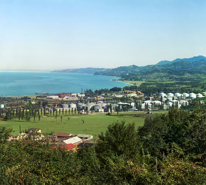Разумеется, Российская империя развивала промышленность не только в Туркестане. На этой фотографии, например, Грузия, нынешний Батуми. Эти края богаты нефтью, и в начале XX века её добычей и переработкой занимались более 20 обществ. Одно из крупнейших принадлежало братьям Нобель. В кадр попали не все стальные резервуары — суммарно их было свыше шестисот. Многие сохранились и поныне.