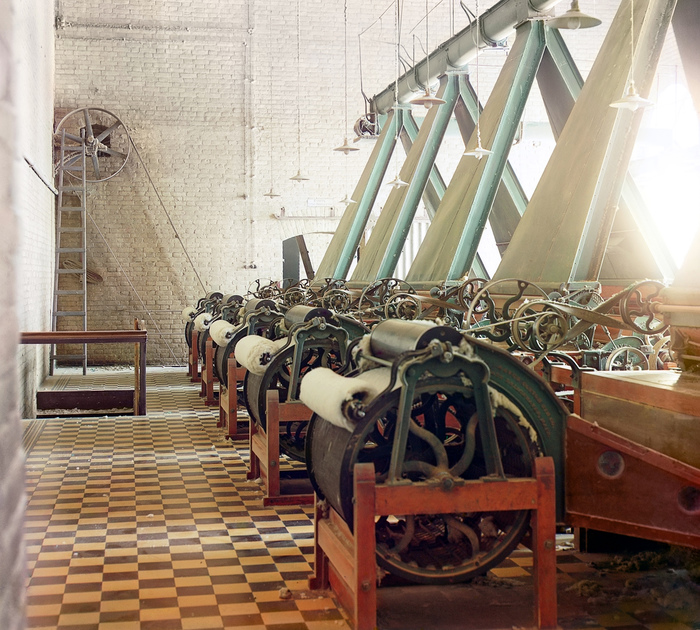В соседнем цехе стояли машины другого типа, которые уже скатывали очищенный хлопок в рулоны. Их приводил в действие общий вал, который, в свою очередь, вращался приводным ремнём. Чаще всего в те годы изначальным источником энергии была паровая машина, но мы помним, что завод в Байрам-Али — едва ли не самое электрифицированное производство в тогдашней России, поэтому мотор, разумеется, тоже был электрический.