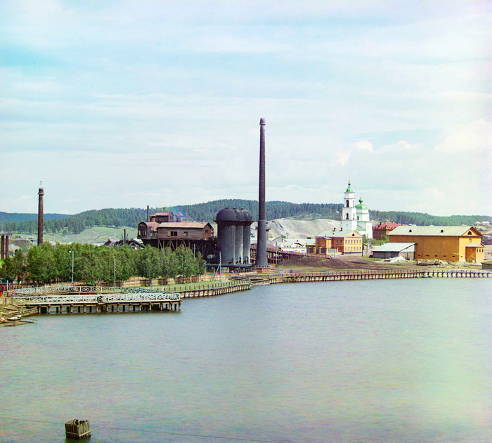 А что же Урал? В главной российской кузнице Прокудин-Горский, разумеется, тоже побывал. К сожалению, цветных снимков с заводами сохранилось не так много — сам фотограф говорил, что ему запретили их вывозить по стратегическим соображениям. Но сохранилось минимум четыре фотографии чугуноплавильного завода в Сатке. Конечно, невероятный контраст между доменными печами и чёрными заводскими трубами с одной стороны и белоснежной церковью — с другой.