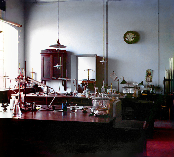 А завершим мы экскурсию по этому технополису 1910-х годов фотографией из его химической лаборатории. Она не была подписана в авторском альбоме, и какое-то время даже считалось, что на ней — лаборатория самого Прокудина-Горского в Санкт-Петербурге. Но исследователи выяснили, что снимок сделан в том же имении Байрам-Али. Видно, что лаборатория хлопкового завода оборудована по последнему слову тогдашней техники. На заднем плане можно разглядеть электрический вентилятор и арифмометр. А если увеличить кадр и присмотреться к минутной стрелке на часах, можно понять, как долго длилась экспозиция каждого кадра.