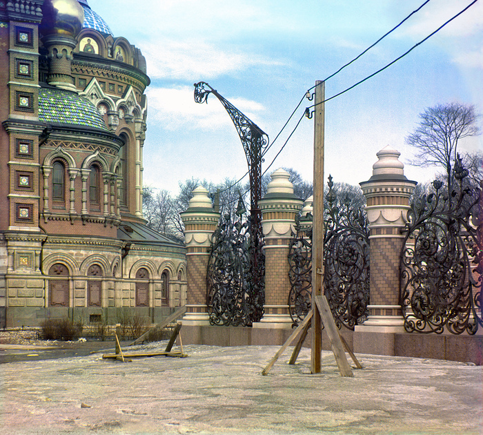 Я много писал об электрификации в южных губерниях, но её признаки видны и на фотографии из Санкт-Петербурга. Мы видим часть знаменитого храма Воскресения на Крови, который в момент съёмки находится на финальной стадии достройки. Интересно, что освещение храма с самого начала было электрическим. Видимо, временная деревянная опора была нужна как раз для этих целей. На втором плане — роскошный фонарный столб, на котором пока нет фонаря. Увы, за прошедшие десятилетия он был утрачен, а вот кованая ограда сохранилась.