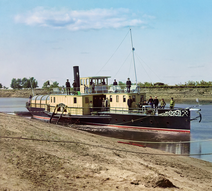 В 1912 году фотограф много путешествовал по самым разным частям России. Здесь мы видим служебный пароход, на котором Прокудин-Горский плыл от Тюмени до Тобольска. Этот кадр сделан кем-то из помощников фотографа, так как самого Сергея Михайловича можно разглядеть на палубе (за столом, в шляпе).