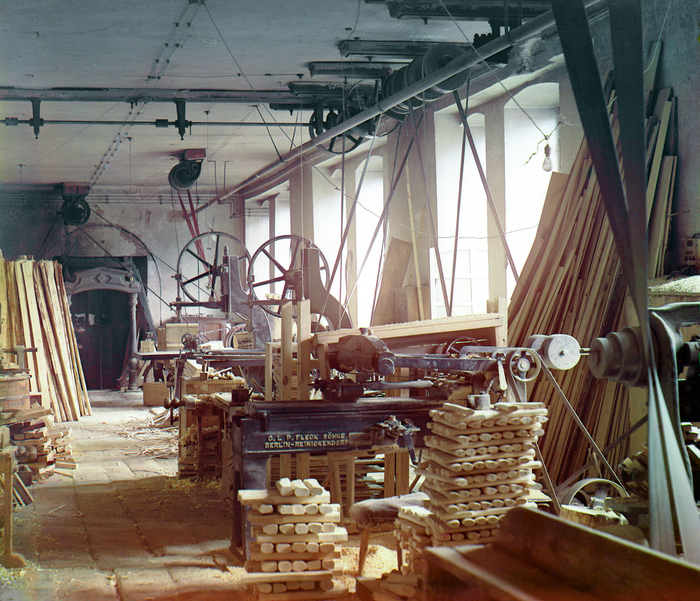 В 1909 году Прокудин-Горский снимает оружейное производство в городе Златоуст, что под Челябинском. На этой фотографии, если верить авторской подписи, запечатлён цех для выделки ножен, хотя больше похоже просто на столярное производство. На станке на переднем плане, по-моему, изготавливаются топорища. Завод сохранился, и в этом цехе по-прежнему занимаются столярными работами, хотя станки, конечно, уже совсем другие.