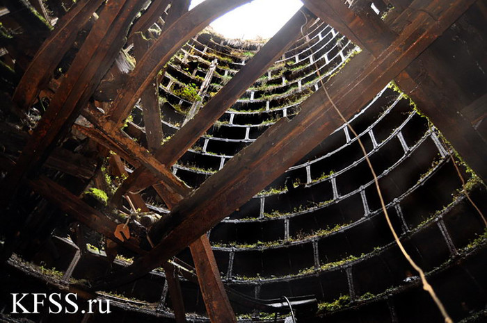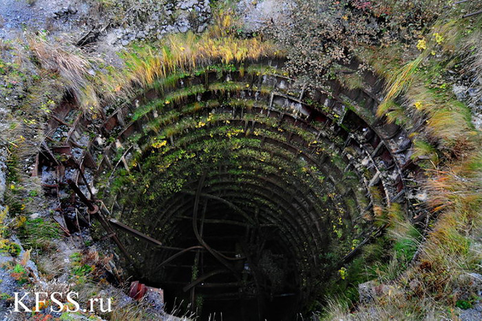Собственно, эта шахта сейчас является главным свидетельством того давнего строительства. Выполненная в монолитном бетоне труба диаметром более 8 метров облицована чугунными тюбингами и уходит на глубину 80 метров. В свободном доступе ныне лишь верхние 20 метров, остальное пространство затоплено и захламлено мусором.