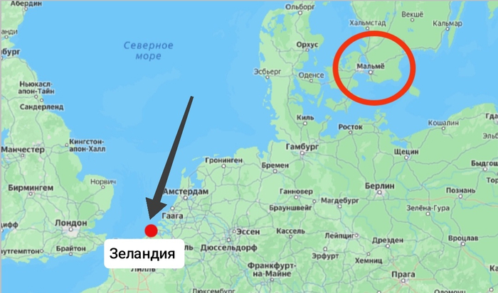 Кстати, все же знают Новую Зеландию? Логично предположить, что раз есть Новая Зеландия, то вот это и есть та самая "старая Зеландия". Но нет. На самом деле Зеландий много. Одна в Дании. Есть ещё в Антарктиде. И даже в Португалии. Но та самая главная Зеландия, от которой пошло название "Новая", на самом деле находится тоже недалеко от этого пролива Эресунн. Вот здесь. В Нидерландах.