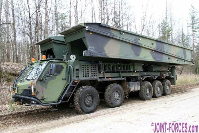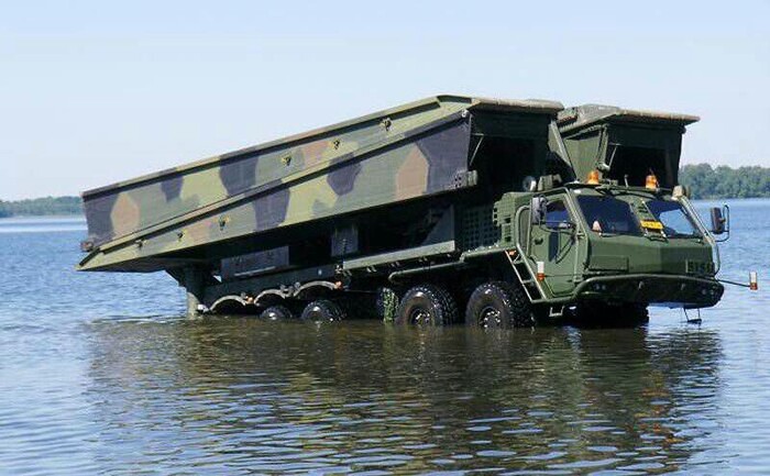 Однако, водные преграды бывают и не очень большие. Было бы странно перед каждой речушкой, оврагом, балкой, или даже каналом останавливаться и ждать, пока приедут понтонеры, мостостроители и паромщики. Сила в маневре, а значит маневр этот нужно обеспечить. В том числе это помогает сделать механизированный мост. Механизированный мост – это готовый мост, поставленный на транспортное средство и устанавливающийся с применением приводных механизмов прямо с машины. В частности, к таким мостам относятся ТММ-3 на базе КрАЗа и модернизированный вариант ТММ-6 на базе колесного тягача МЗКТ. В комплект моста ТММ-3 входят четыре машины, каждая с секцией длиной 10,5 метров. Секции имеют промежуточные опоры и устанавливаются одна за другой, позволяя преодолевать препятствие шириной в 40 метров. При этом однопролетный мост устанавливается буквально за 11 минут. Полный комплект за 75 минут. У комплекта ТММ-6 секции намного длиннее – 17 м, и общая длина препятствия соответственно увеличена. Комплект ММК устанавливается на длину в 40 м, но уже не за 75 минут, а за 45. Грузоподъемность таких мостов – 60 т. То есть, как видите, небольшое препятствие такие машины позволяют преодолеть очень быстро. Но поскольку такие машины небронированные и передвигаются на колесном шасси, применять их можно только по дорогам и вне боя.