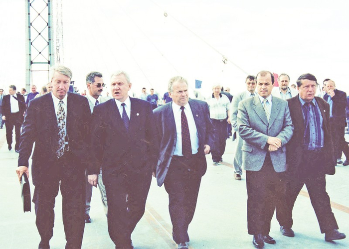 Открытие моста через р. Обь в районе г. Сургут. На фото: первый губернатор ХМАО Александр Васильевич Филипенко (в центре); генеральный директор АО "Мостострой-11" Валентин Фёдорович Солохин (справа)