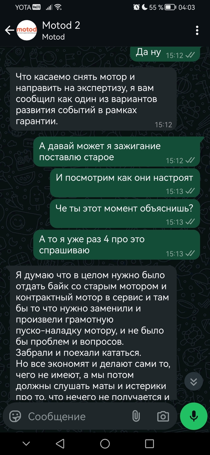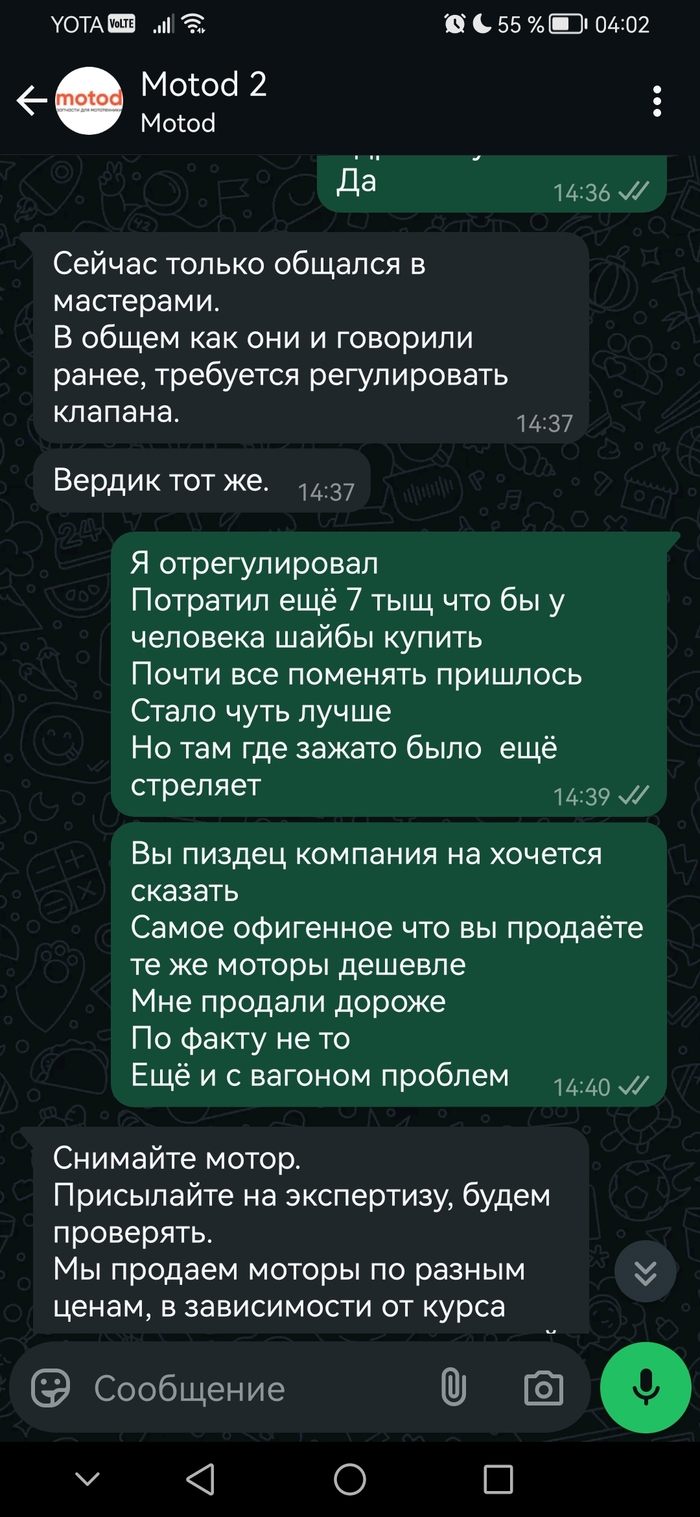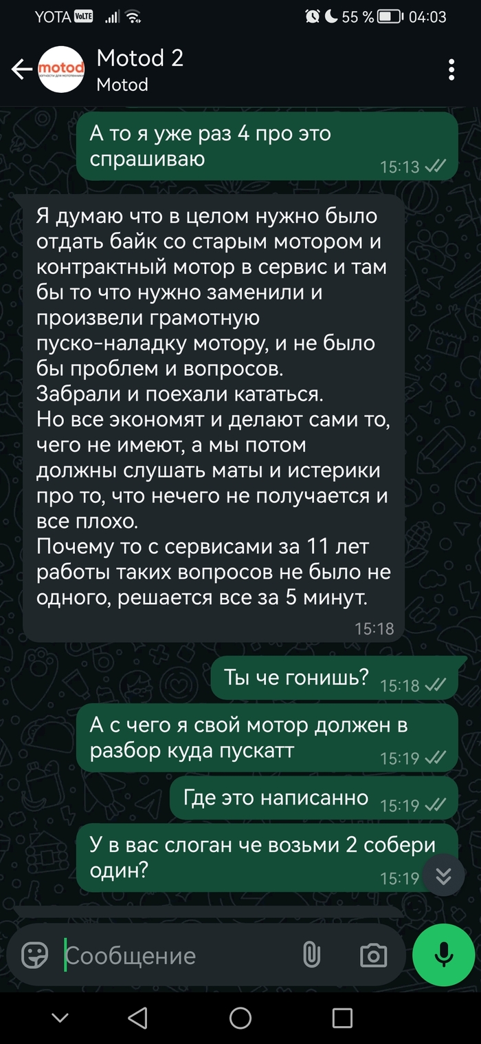 Как итог Компания присылает не контрактные двигатели с малым пробегом, а просто с разбора . Проверки двигатели никакой не удостаиваются. Мотор может быть перебранным на коленке через заднюю полку директора (как в моем случае) с перебитым номером и конским пробегом Могут прислать не ту модель и разукомплектованную и это не беспокоит Motod. После того как вы перевели бабки на вас начинают слегка ложить чл болт, но хорошо это начинает ощущаться когда у вас возникают проблемы с мотором. Ссылки ( что пошёл нах**) то что вы должны сами ремонтировать то за что отдали деньги, появляются после притензий неожиданно в которых можно ссылаться практически на любую поломку И лежат эти ссылки так что даже не найти через сайт На неудобные вопросы будут закрывать глаза и переводить разговоры в другое русло Компания присылает не контрактные двигатели с малым пробегом, а просто с разбора . Проверки двигатели никакой не удостаиваются. Мотор может быть перебранным на коленке через заднюю полку директора (как в моем случае) с перебитым номером и конским пробегом Могут прислать не ту модель и разукомплектованную и это не беспокоит Motod. После того как вы перевели бабки на вас начинают слегка ложить чл болт, но хорошо это начинает ощущаться когда у вас возникают проблемы с мотором. Ссылки ( что пошёл нах**) то что вы должны сами ремонтировать то за что отдали деньги, появляются после притензий неожиданно в которых можно ссылаться практически на любую поломку И лежат эти ссылки так что даже не найти через сайт На неудобные вопросы будут закрывать глаза и переводить разговоры в другое русло