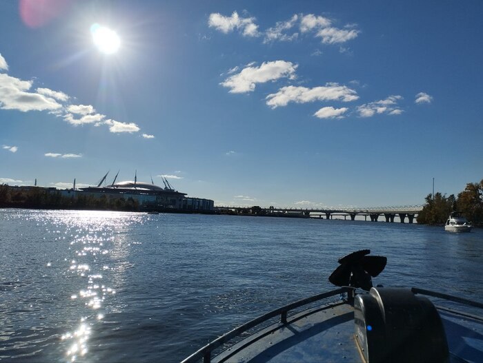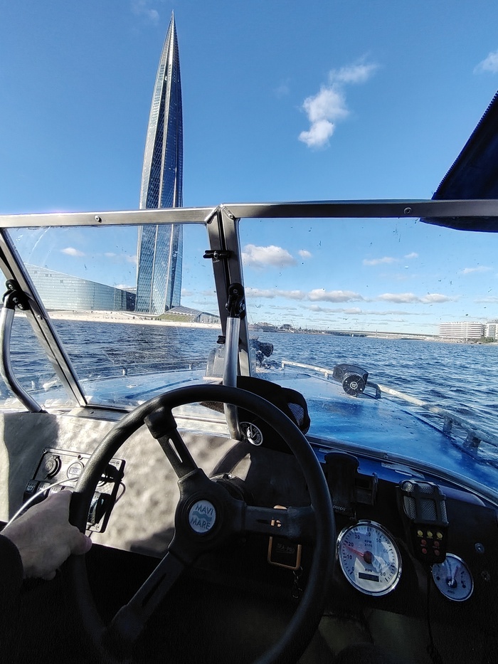 Погодка способствала, денёк выдался солнечным и не особо ветренным, поэтому решили прокатиться до Лахта-центра. Коллеги удобно устроились на заднем диване, ну а мне предстояло получить первый опыт судоводителя. Ну и побыть трезвым водителем 🥲. Ну и к 12 часам мы были уже на воде