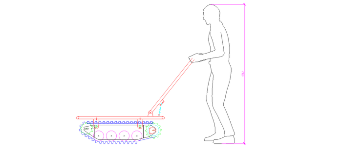 В первом приближении было решено использовать наиболее короткую (периметр 2,1 м) композитную гусеницу шириной 38 см. Гусеничный модуль при этом получается около 1 метра в длину. На схеме изображен человек ростом 176 см (чуть выше среднего по РФ) для визуальной пропорции. В следующих вариантах устройства будем использовать более длинную гусеницу, соответственно и длина модуля увеличится.