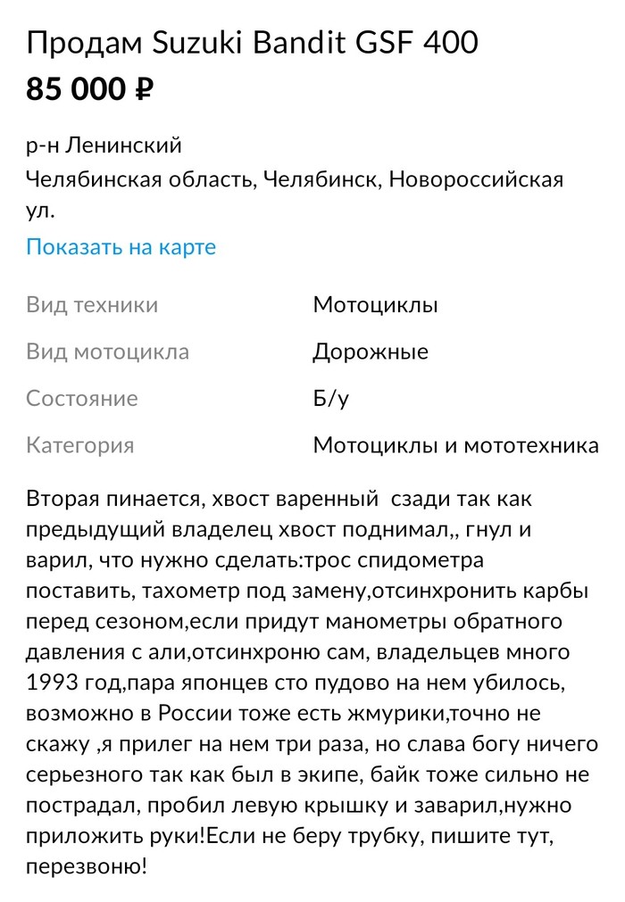 Ввиду своего скупердяйства покупаю и продаю б\у электронику и прочую ерунду довольно часто. Забавных историй всех и не упомнить. Но в один момент я решил исполнить юношескую мечту и купил себе мотоцикл возрастом в 15 лет, видавшую жизнь Honda. Вот такой.