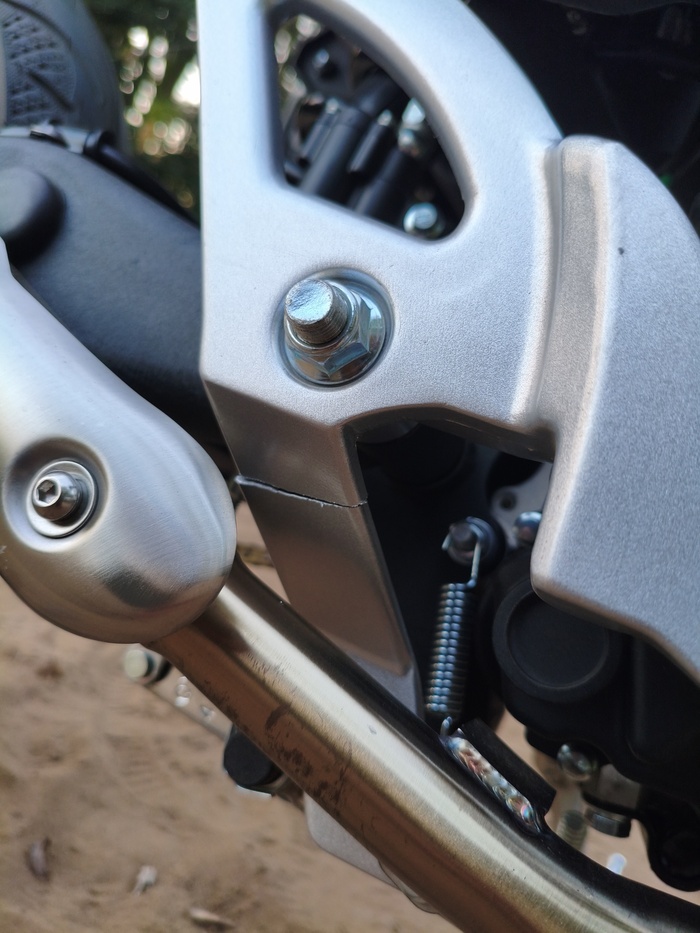 По дороге лопнул кронштейн лапки, так что правая нога ушла вниз и я чуть не навернулся на проселочной дороге, а мопеду ещё и 50-ти километров нет... Но я же закаленный ветрами и опытом бродяга, захватил с собой половину гаражного инструмента. Затянул покрепче, на обратную дорогу сойдет.