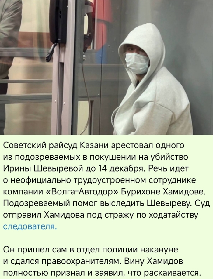 Советский райсуд Казани арестовал одного из подозреваемых в покушении на убийство Ирины Шевыревой до 14 декабря. Речь идет о неофициально трудоустроенном сотруднике компании «Волга-Автодор» Бурихоне Хамидове. Подозреваемый помог выследить Шевыреву. Суд отправил Хамидова под стражу по ходатайству следователя.