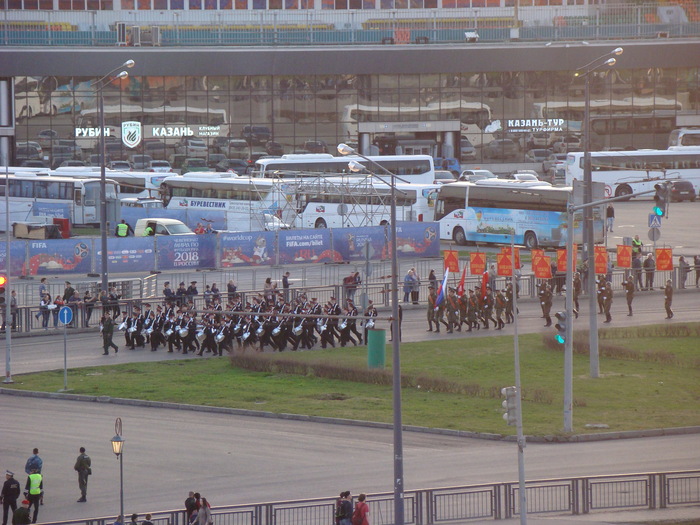 Улицы в Казани достаточно протяжённые, достопримечательности разбросаны в разных местах. Если есть желание возьмите на прокат велик или ролики и прокатитесь по набережной или по паркам города, которых здесь не мало. Мы заглянули на набережную утром, а в этом время тут ещё никого нет и большинство заведений закрыто. Так как близилось 9 мая, то на улице была репетиция парада. Всё как в лучших традициях: красочно, насыщенно и интересно.