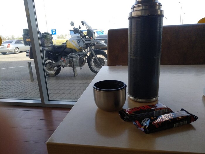 Далее за 2 часа из весны я приехал в лето (стало +32) и я понял, что начинаю ловить тепловой удар. Быстро переоделся, залился чаем и остыл на заправке.