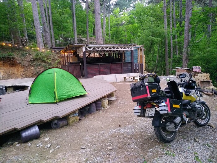 Место ночёвки выбрал заранее — это кемпинг в горах на севере Ялты (44.492026, 34.103614). Что примечательно: дорога до него смесь эндуро и улиц города. Само место потрясающее: небольшая поляна между двух скал с горным ручьём и всеми удобствами. И да, я снова был один. Вечером ещё включили тёплые фонарики для большей ламповости. Попробовал свой комплект для походной жизни и надо сказать был приятно удивлён. Собирал его несколько лет, но проверить в деле руки не доходили. Напишу, пожалуй, об этом отдельный пост.