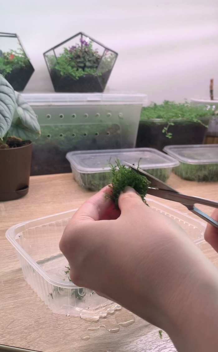 2. Подготавливаем невысокий герметичный контейнер и мелко нарезаем мох (чем мельче нарежете, тем больше точек роста будет у мха. Чем больше точек роста - тем пышнее он будет в будущем)