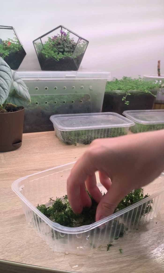 Важно, чтобы мох был немного влажным, но не залитым или пересушенным. Если случайно залили - вылейте излишки воды и сделайте небольшие дырочки в контейнере. Если мох уже подсушился - его нужно просто немного опрыскать.