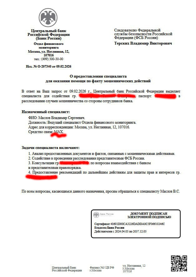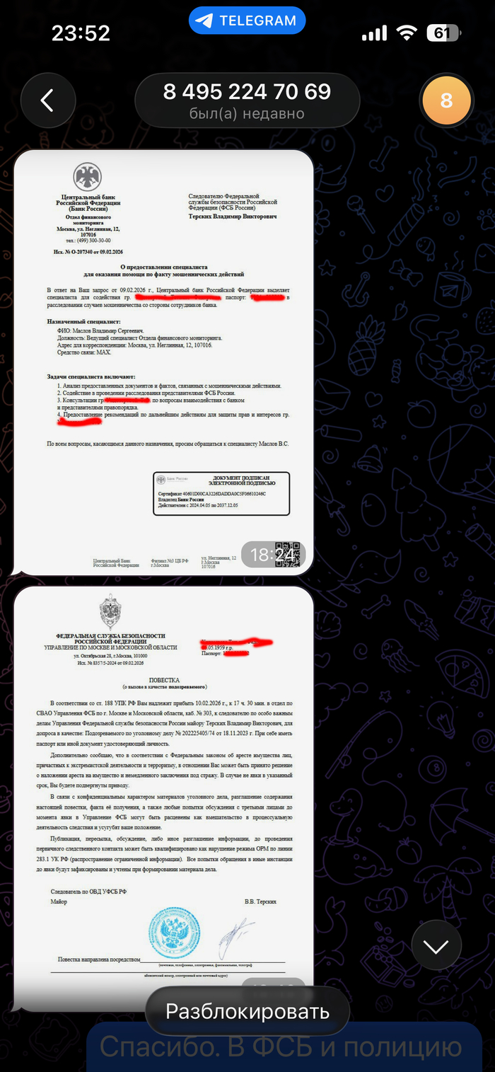 После переписки звонит "майор ФСБ" и начинает уже "приседать на уши" и обрабатывать на тему "измены Родине" и сделанному переводу ВСУ. Переключается на видеосвязь, где показывает свое удостоверение, "повестку от ФСБ" и еще всякую "важную" хрень. Обрабатывает долго, почти 2 часа. Говорит что с ней свяжется специалист ЦБ, которого ей дали для защиты ее интересов. Звонит этот "специалист". Опять грузит всякой страшной информацией, и попутно объясняет, как поставить Телеграмм и в нем зарегистрироваться. Потом опять преключает на "ФСБшника". Тот ей шлет сканы всяких "офимциальных документов":