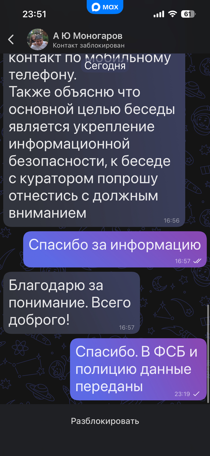 При этом в разговоре всплывает много личных перслональных данных, таких как дата смерти отца, номер идущего наследственного дела, данные о родственниках, номер паспорта, данные о моей семье, о том, в каких банках есть счета. (Тут я вспомнил "добрым матерным словом" нашу защиту перс.данных и защищенный госмессенджер макс, которому можно доверять, как орут с нашего благословенного ТВ). И тут, наконец, у мамы в голове что-то щелкнуло, и она решила мне написать с оставшегося от отца телефона. Хотя мошенники стопиццот раз давили на полную секретность и на то, что ее и всех посадят за разглашение разговоров и общения. Слава великой рыбе, макаронному монстру и случаю, что я задержался в этот день с отправкой на отдых, глянул в телефон и прискакал. К утру, я думаю, обработка-зомбирование была бы успешно завершена и все перешло бы к спасению на безопасных счетах или чему то подобному.