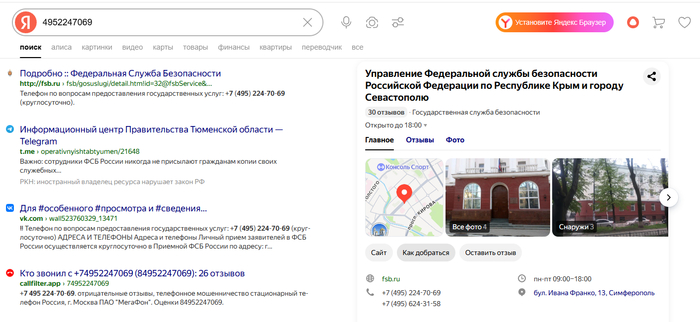 И давит что завтра, в полшестого утра, у ней придут "оперативники ФСБ", чтобы забрать ее в Москву на допрос и задержание. Теперь звонок идет типа с официального номер а ФСБ через Телеграмм. Предлагает проверить номер из Телеги в Яндексе, где показывает что номер пренадлежит "Управление Федеральной службы безопасности Российской Федерации по Республике Крым и городу Севастополю".