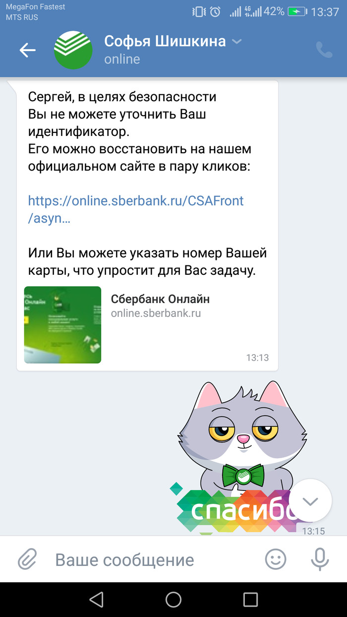 Сегодня не работал сайт и приложение Сбербанка. Я об этом оставил коммент в официальной группе Сбера. И через несколько минут, мне написала в ВК некая Софья Шишкина.
