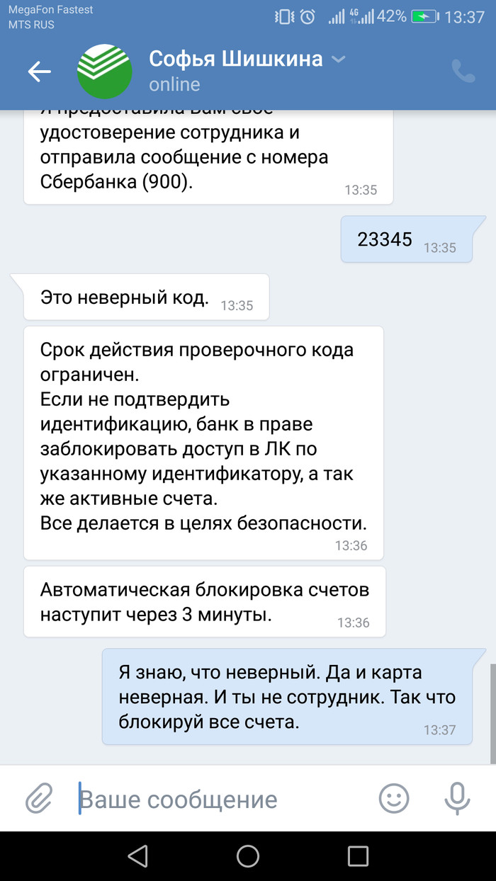 После этого я отморозился и не писал больше. Но Софья не отстала на этом. Спросила, на связи ли я еще? Я говорю - на связи. Просит номер карты. Я в ответ попросил удостоверение сотрудника. Она прислала фотку удостоверения в стиле инстаграм. Там была действительно Софья Шишкина, но город Белгород, а не Москва. Ну да ладно. Написал номер карты, заведомо неверный. Далее она попросила код из смс. Написал ей код.