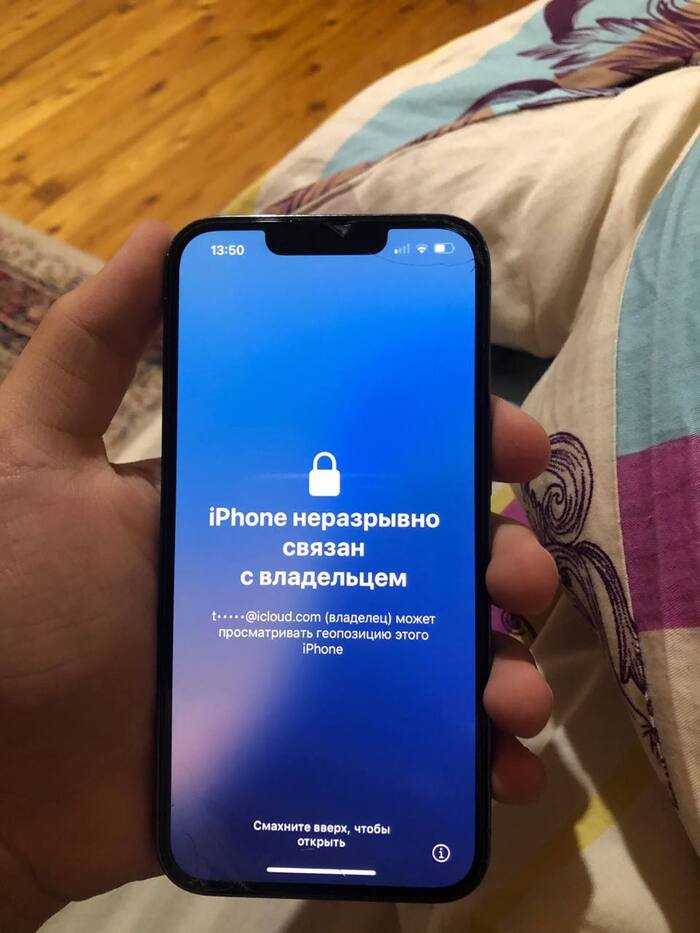 На устройстве написано: «iPhone неразрывно связан с владельцем» и указана часть логина мошенника. Шансы разблокировки высокие, но могут потребоваться минимальные данные о мошеннике.