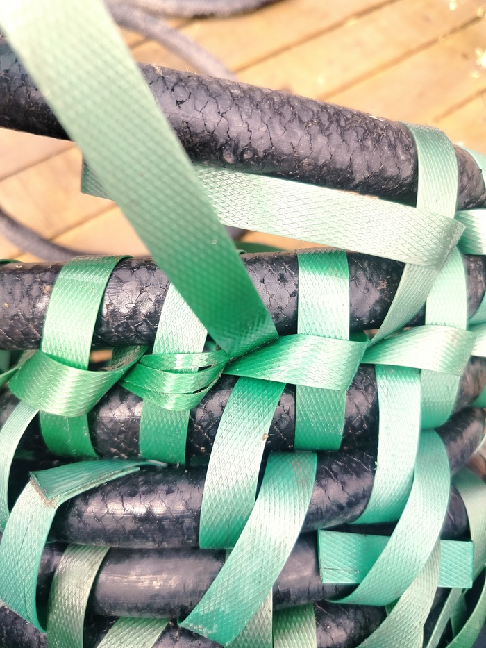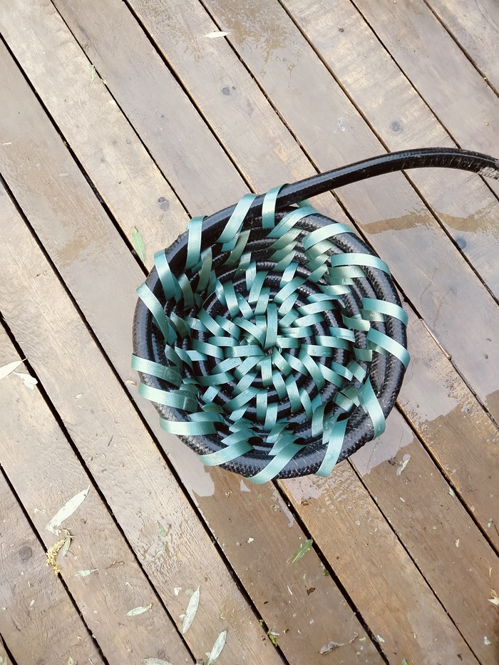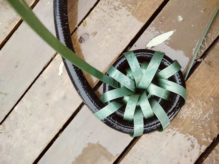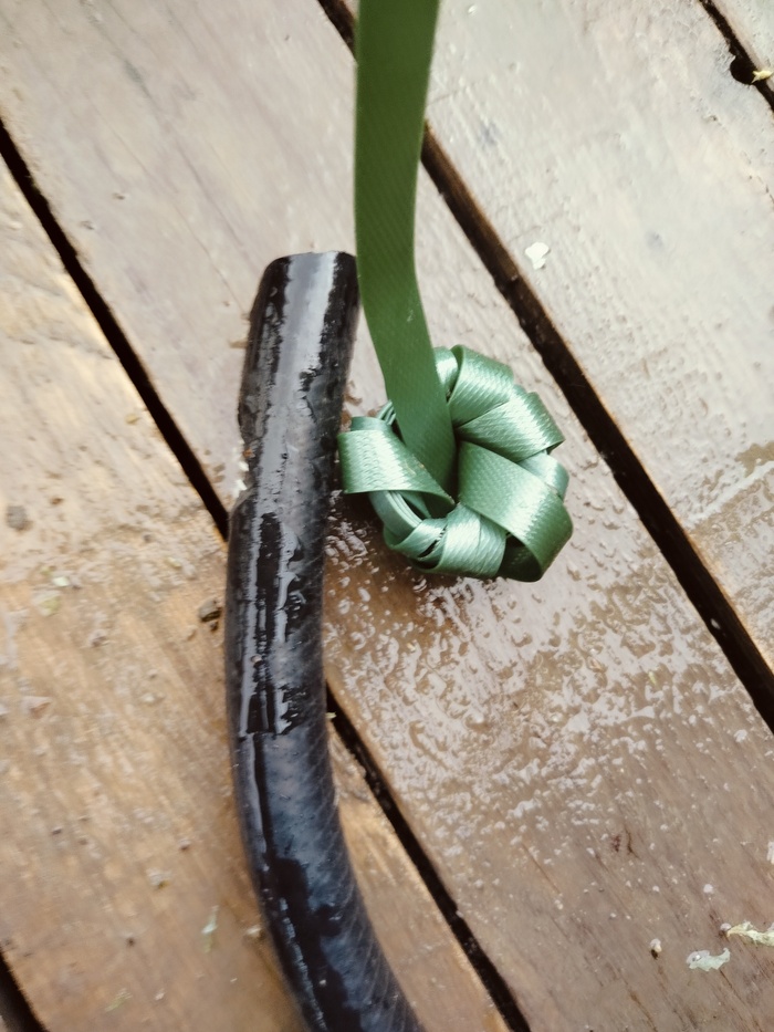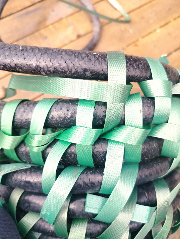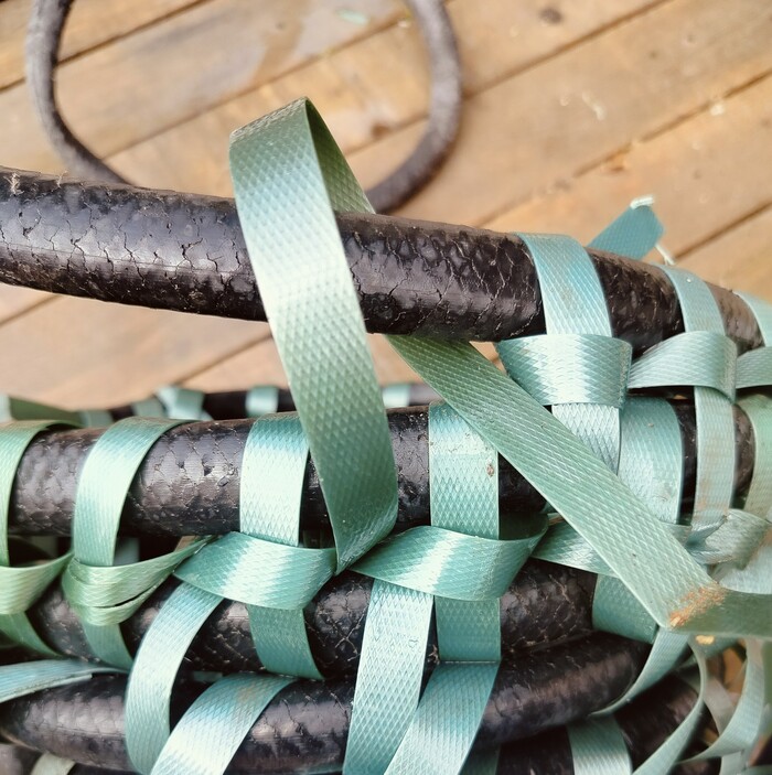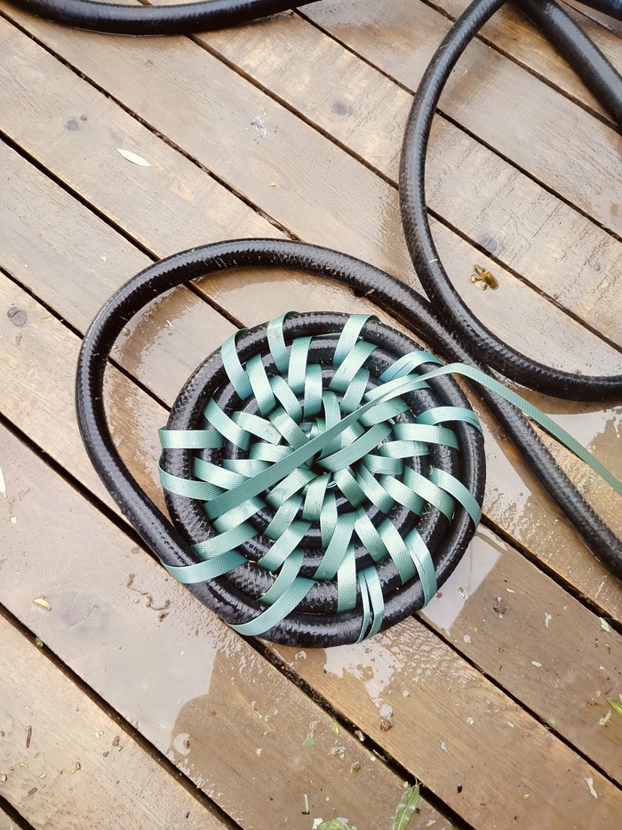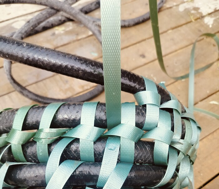 Из ленты сворачиваю кольцо. В кольцо продёргиваем ленту. Обматываем шланг. Всё делали здесь Ремесло. Простая оплётка.
