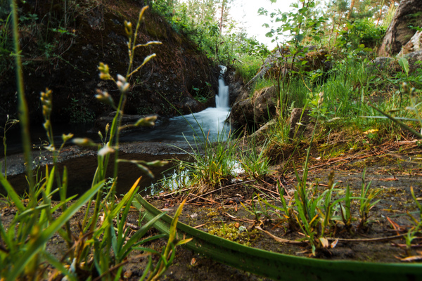 В нескольких дестяках метров от карьера есть небольшой водопад.