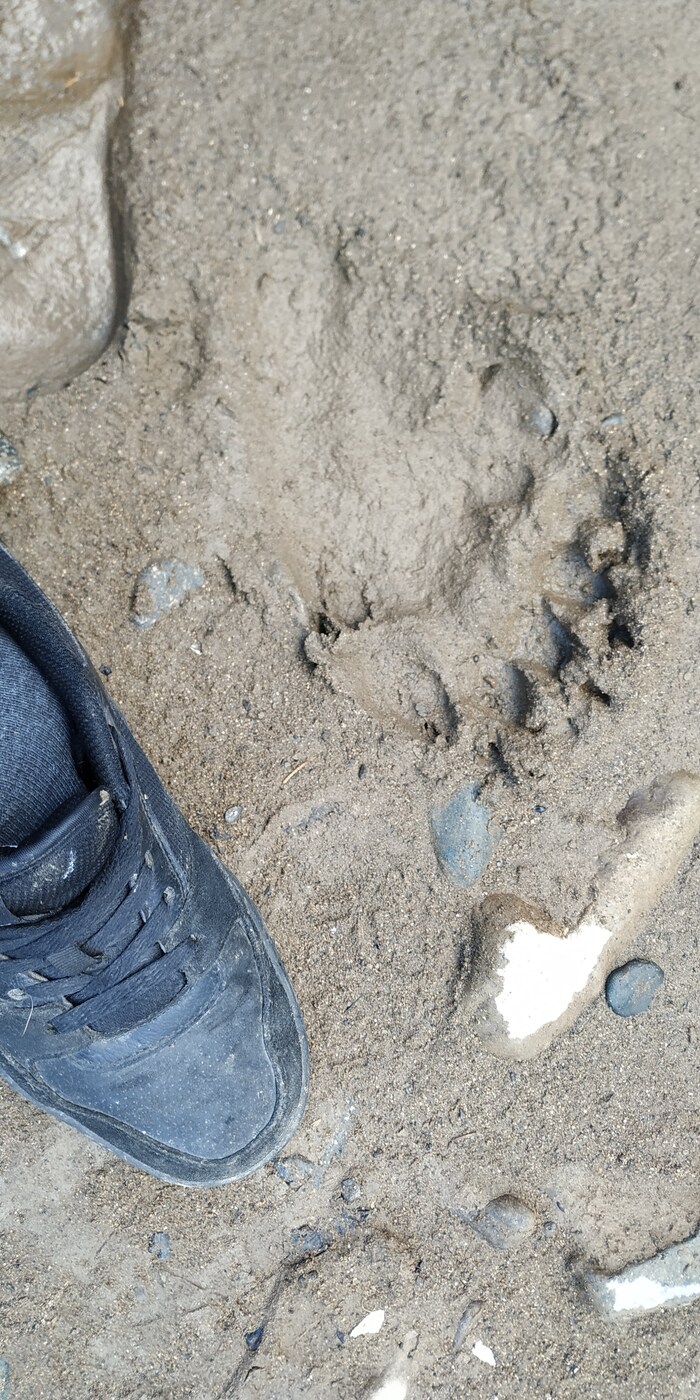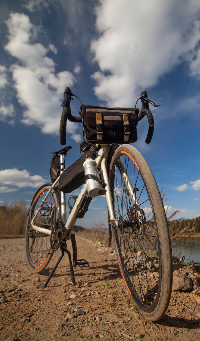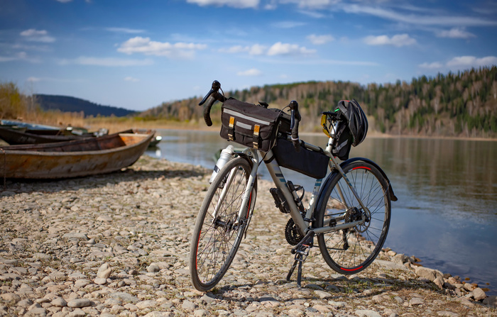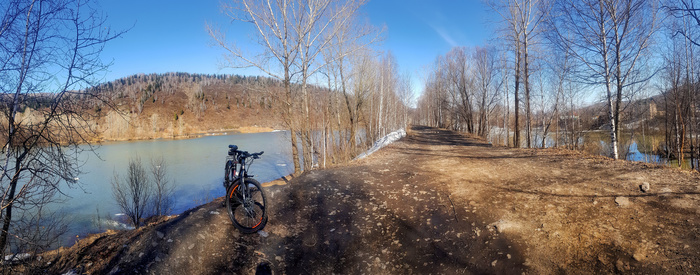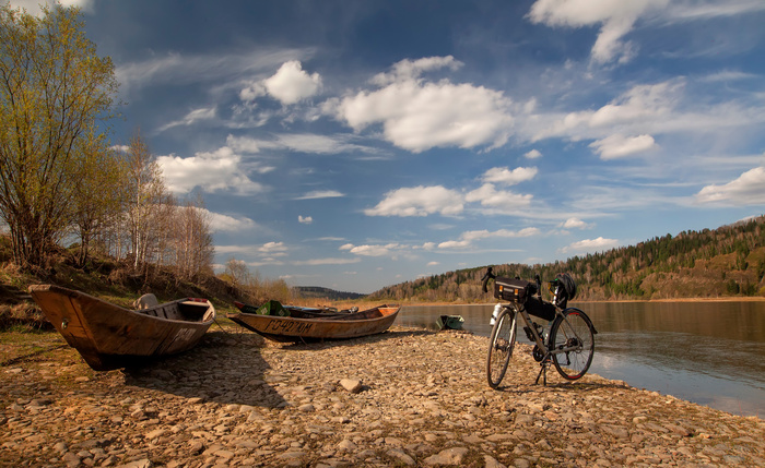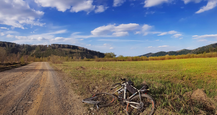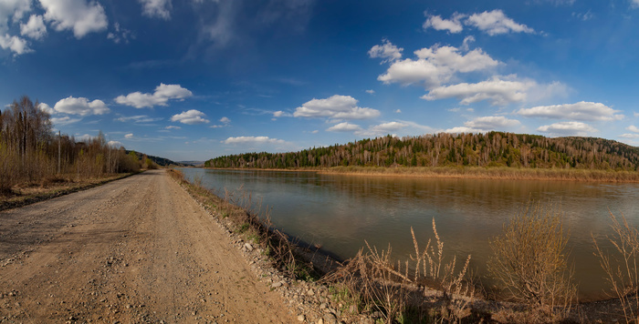 И велику напомним, что он урожденный гравийник, неча сачковать на асфальте. Во, родная стихия. Грунтовая дорога вдоль реки. Между прочим по ней регулярный автобус ходит. И мы пройдем.