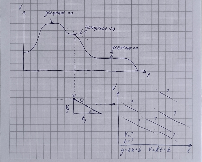 И теперь для того, чтобы попасть в нужную нам исходную точку, нам необходимо найти эту самую константу, а для этого потребуются исходные данные (начальные условия) в виде скорости V и времени t в исходной точке. Попадая в эту точку, мы находим частное решение (уравнение со всеми известными коэффициентами). Что нам может дать это частное решение в данном случае? Спрогнозировать какая будет скорость за ближайшее время (в данном случае это через 1-3 секунды). Но как вы понимаете, это далеко не точные данные, т.к. первоначальный график был не линейный, а хаотичный. С помощью одной проведенной такой процедуры мы не построим исходный график движения, мы лишь его охарактеризовываем только в один какой-то конкретный момент времени.