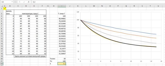 Далее строим второй график только уже не по измеренным данным, а по формуле, указанной выше. Подставляем те же t, а коэффициент k подбираем вручную, чтобы теоретическая зависимость максимально повторяла экспериментальную (эмпирическую).