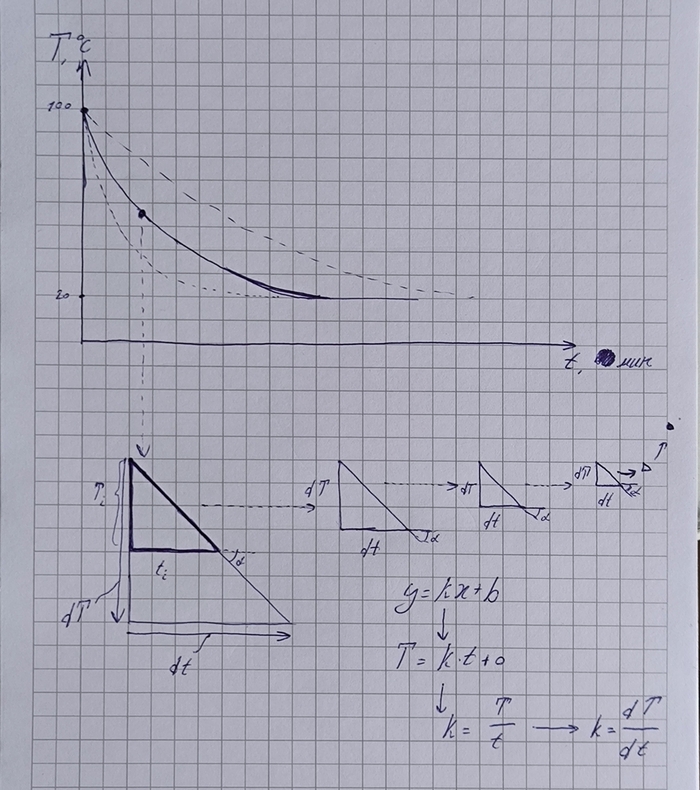 Если мы просто проведём касательную к графику и достроим треугольник, то угол наклона как раз будет описываться коэффициентом T/t, что соответствует прямой y=kx+b, где b мы принимаем за ноль (т.к высота графика относительно оси y не влияет на данный анализ), y - это температура Т, х - это время t.