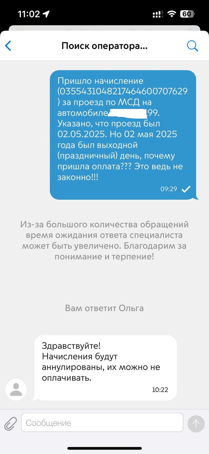 Каждый день по работе приходится проезжать по гребанной МСД, за 2 месяца более 40 раз проехал, каждый раз приходит штраф на госуслуги на7 рублей за проезд, не как на М 12 и цкад в приложении на оплату уведомление, это специально сделано? а то теперь я злостный нарушитель, хотя через приложение парковки России даже автооплата подключена. Служба поддержки ничего сказать не может, почему проезд на Госуслугах называется штрафом, предлагают письма писать с ответом через 30 дней.